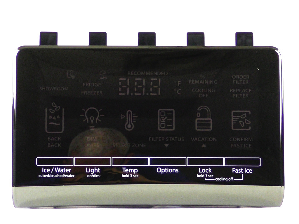 This refrigerator dispenser user interface control assembly manages ice and water dispensing functions along with the digital display on the door. It is commonly replaced when dispenser buttons become unresponsive, the display shows incorrect readings, flashes, or emits random beeping. The assembly features a silver finish and installs inside the refrigerator door by swapping the wire harness and securing the new control in place. Installation requires disconnecting power to the refrigerator before servicing. Size and dimensions may vary by model.